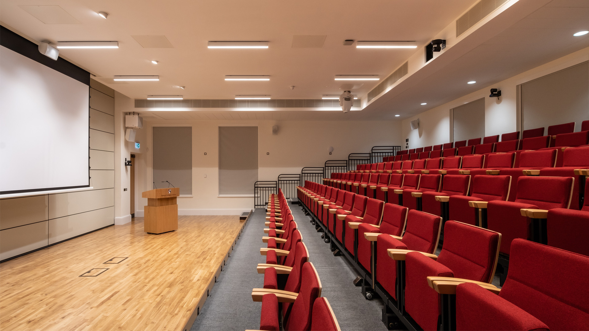 The Auditorium is a multipurpose facility fit for the 21st Century, and shows off brilliantly what can be achieved when retractable seating is combined with movable walls. The auditorium is not only for use by the college, it is also intended for public events, and forms part of the university’s portfolio of conference spaces.