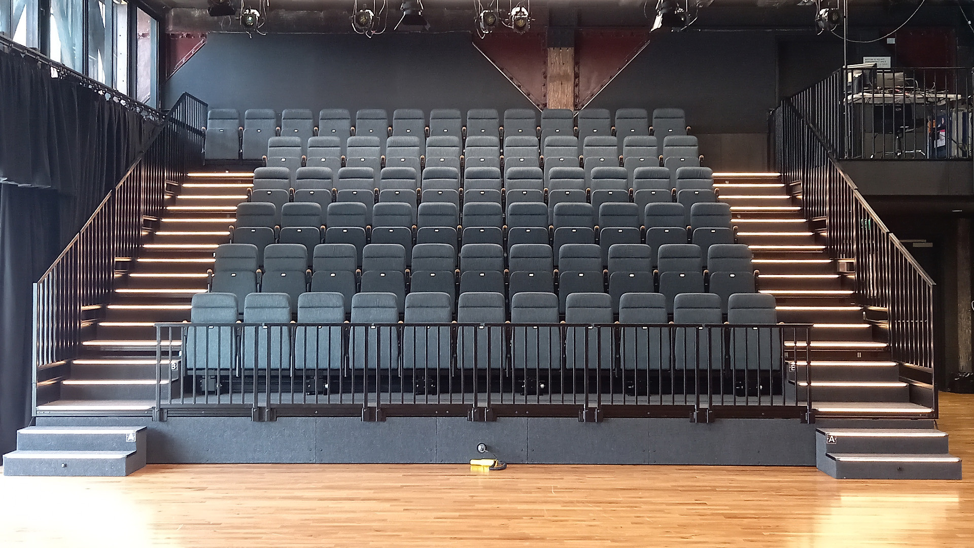 Our partners Maxwood Technology undertook a beautiful fitout of the space, with a high specification retractable seating system by Audience Systems and a Junckers sprung dance floor.