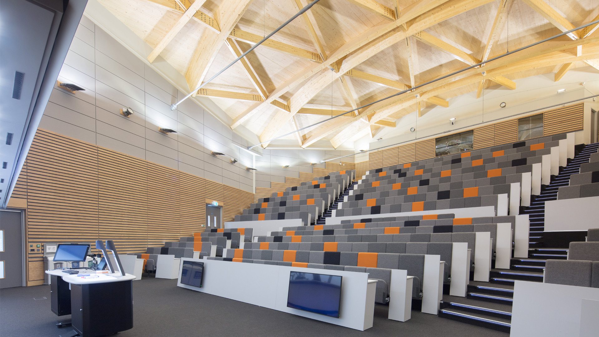 The Oculus is the University’s new, flagship teaching and learning building. In the centre of the building, beneath the stunning laminated timber roof, nest two stacked lecture theatres, both of which feature Audience Systems’ quietly elegant Scholar lecture theatre seating.