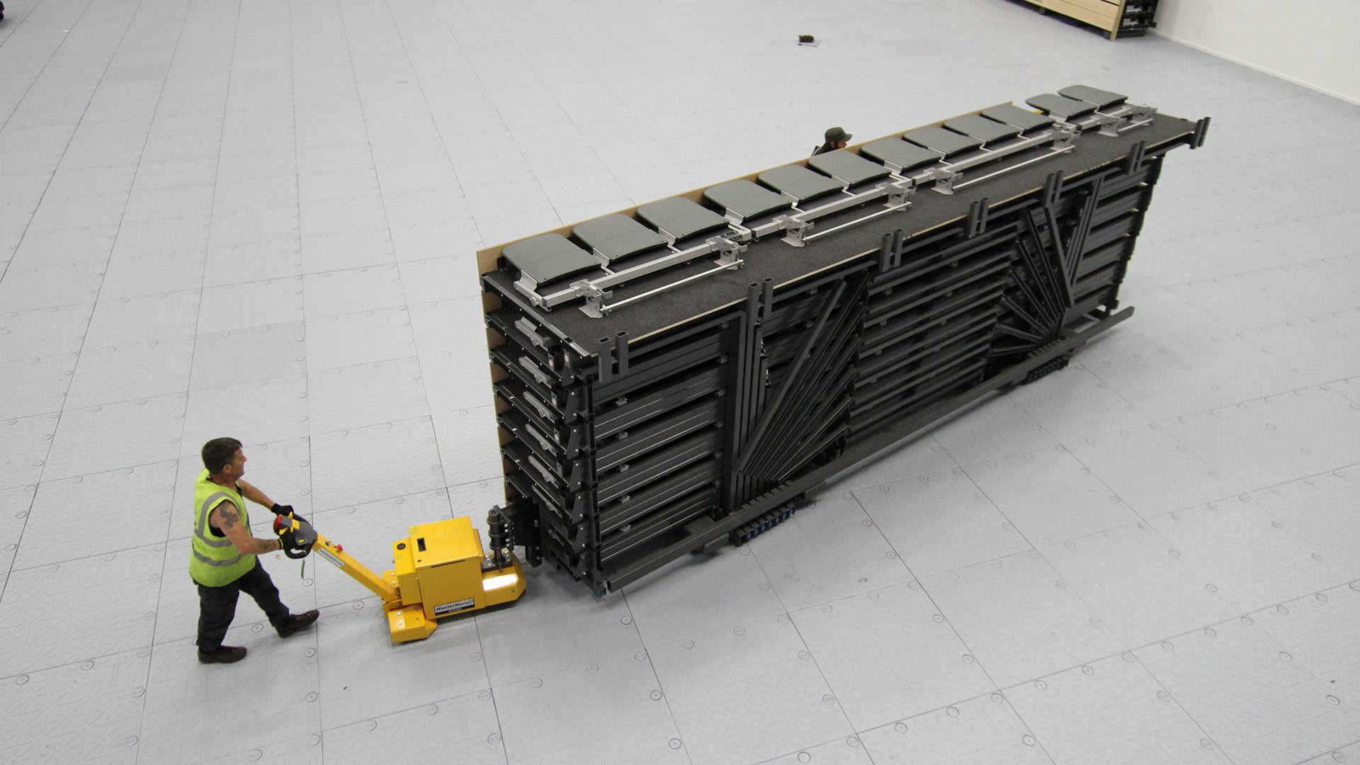 Our telescopic platforms can be retracted quickly and simply using integrated motors, controlled using a detachable push-button pendant. Alternatively, the tribunes can be retracted using a separately supplied “power truck”. Smaller telescopic platform systems can be pulled in and out manually using 2 pull handles.